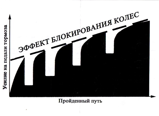 Что же касается автомобилей без системы ABS, то тут необходимо выполнять комбинированное торможение: нажимать и немного приотпускать педаль тормоза, одновременно переходя на пониженные передачи. График такого торможения должен выглядеть примерно так: